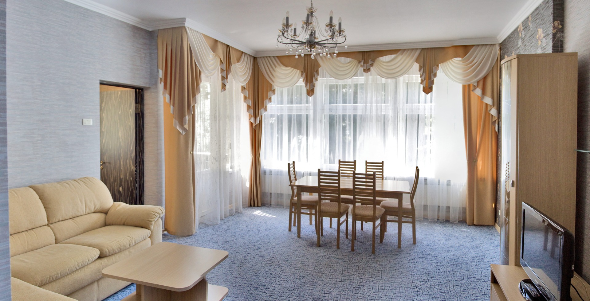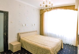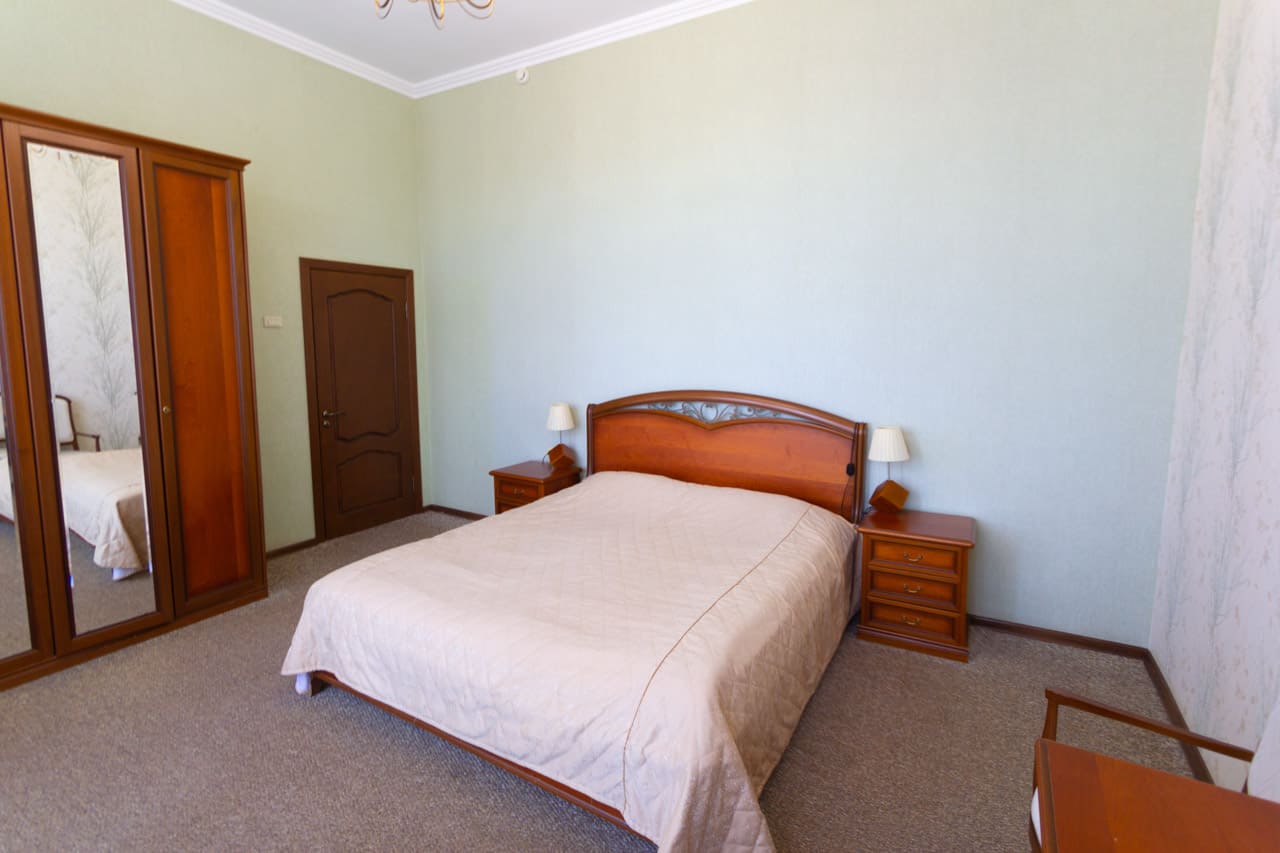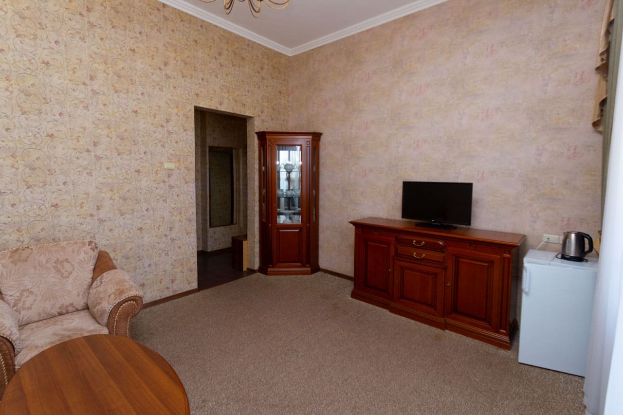 - 2-местный 2-комнатный Люкс. Площадь номера: 70 кв.м. В номере: В номере: балкон, спальня с двуспальной кроватью, сплит-система, гостиная с набор мягкой мебели, телевизор, холодильник, электрический чайник, чайный набор, набор посуды, гладильная доска, утюг. Санузел с душевой кабиной, ванна, фен, халат, тапочки.