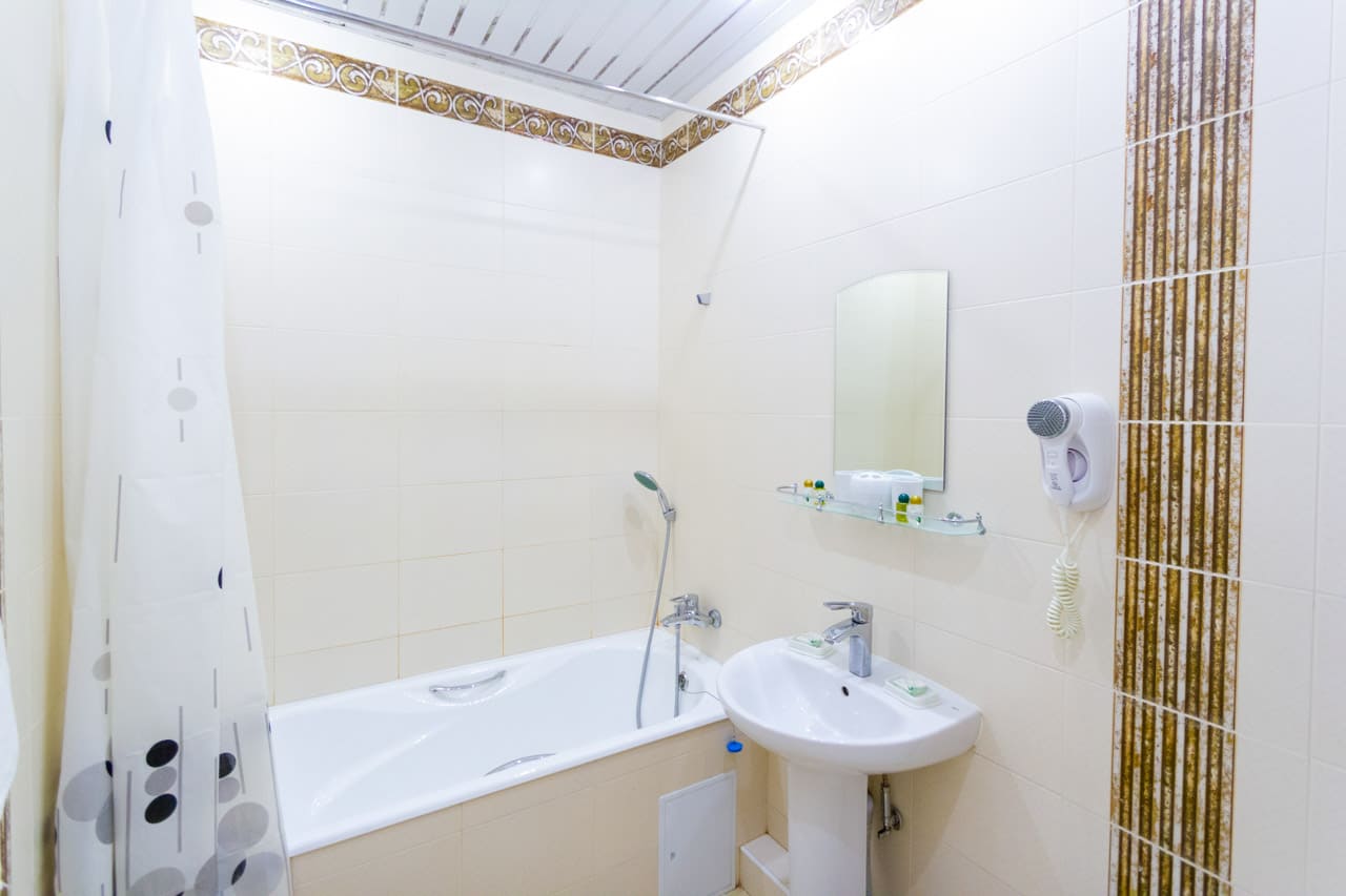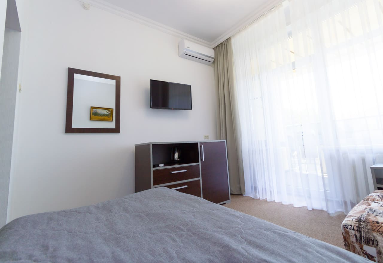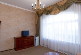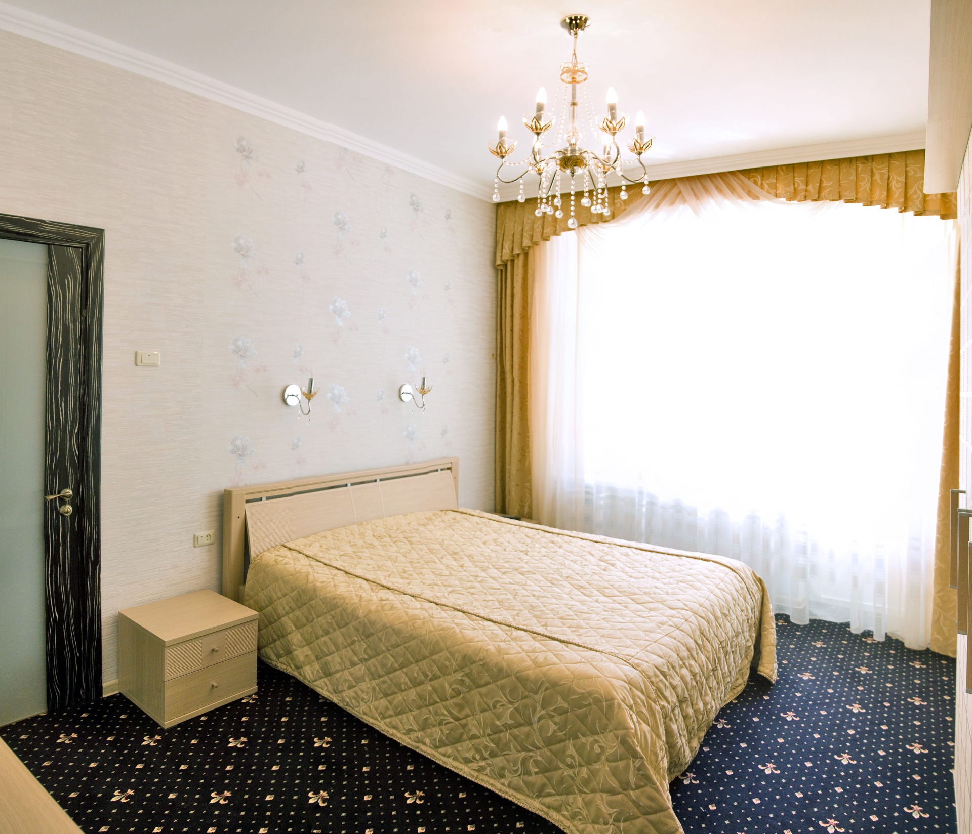 - 2-местный 2-комнатный Люкс. Площадь номера: 70 кв.м. В номере: В номере: балкон, спальня с двуспальной кроватью, сплит-система, гостиная с набор мягкой мебели, телевизор, холодильник, электрический чайник, чайный набор, набор посуды, гладильная доска, утюг. Санузел с душевой кабиной, ванна, фен, халат, тапочки.