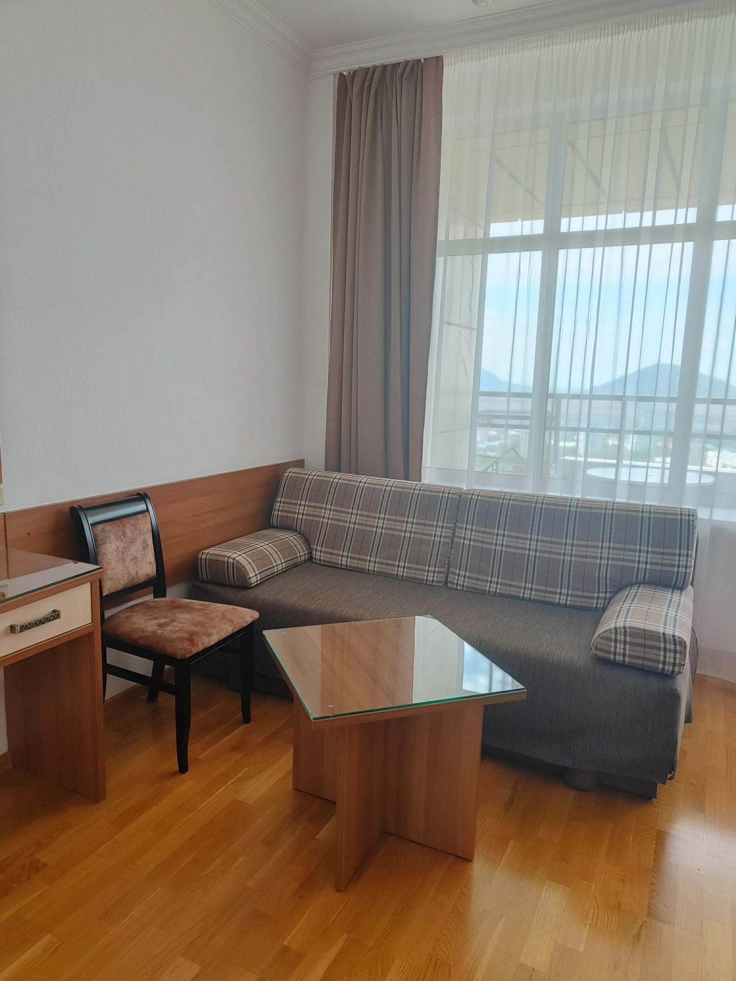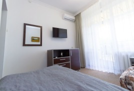- 2-местный 2-комнатный Полулюкс. Площадь номера: 44 кв.м. В номере: балкон, спальня с двуспальной кроватью, гостиная с набор мягкой мебели, телевизор, холодильник, электрический чайник, чайный набор, набор посуды, гладильная доска, утюг. Санузел с душевой кабиной, фен, халат, тапочки.
