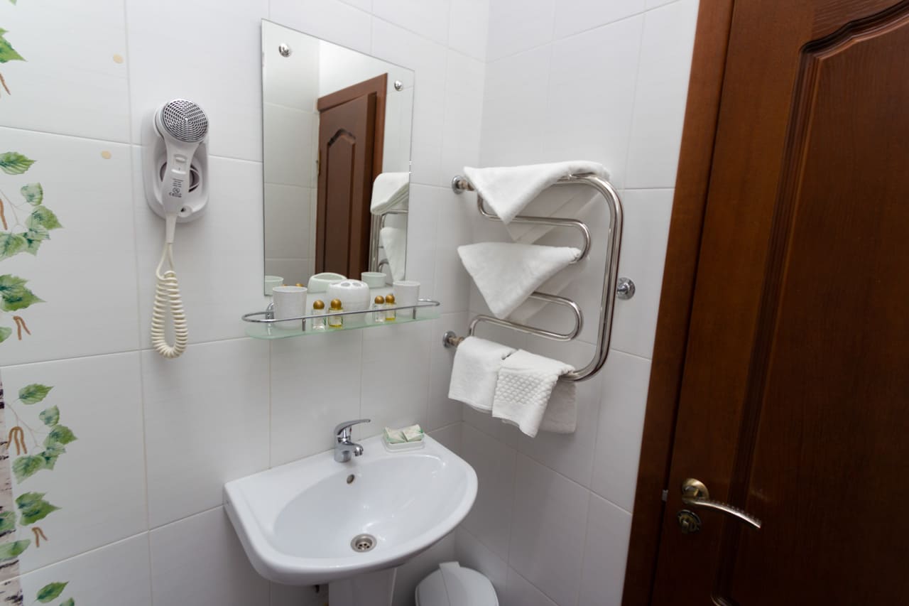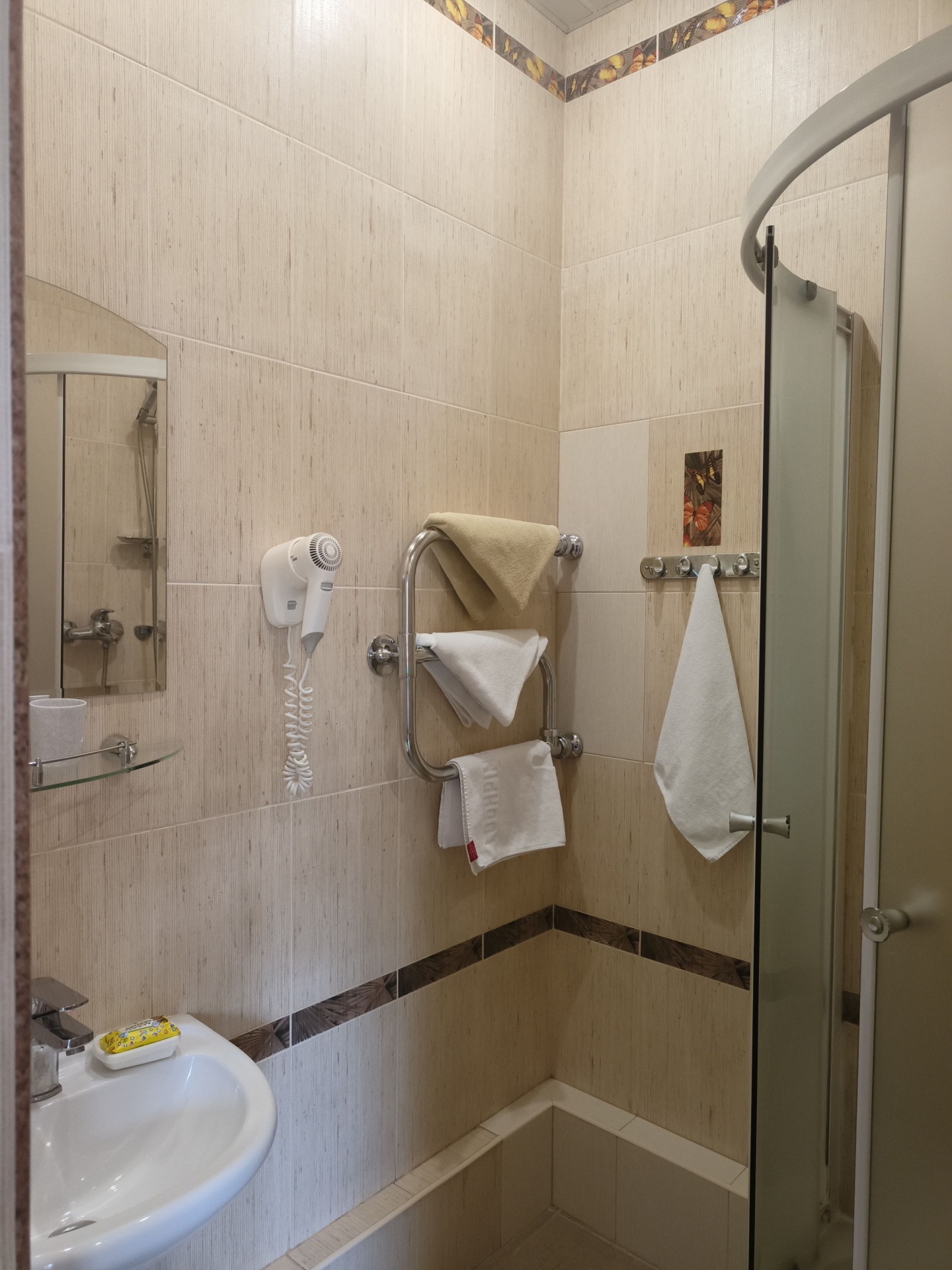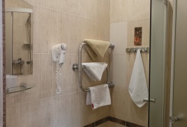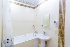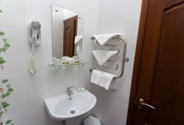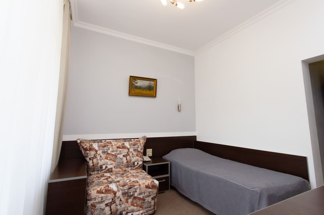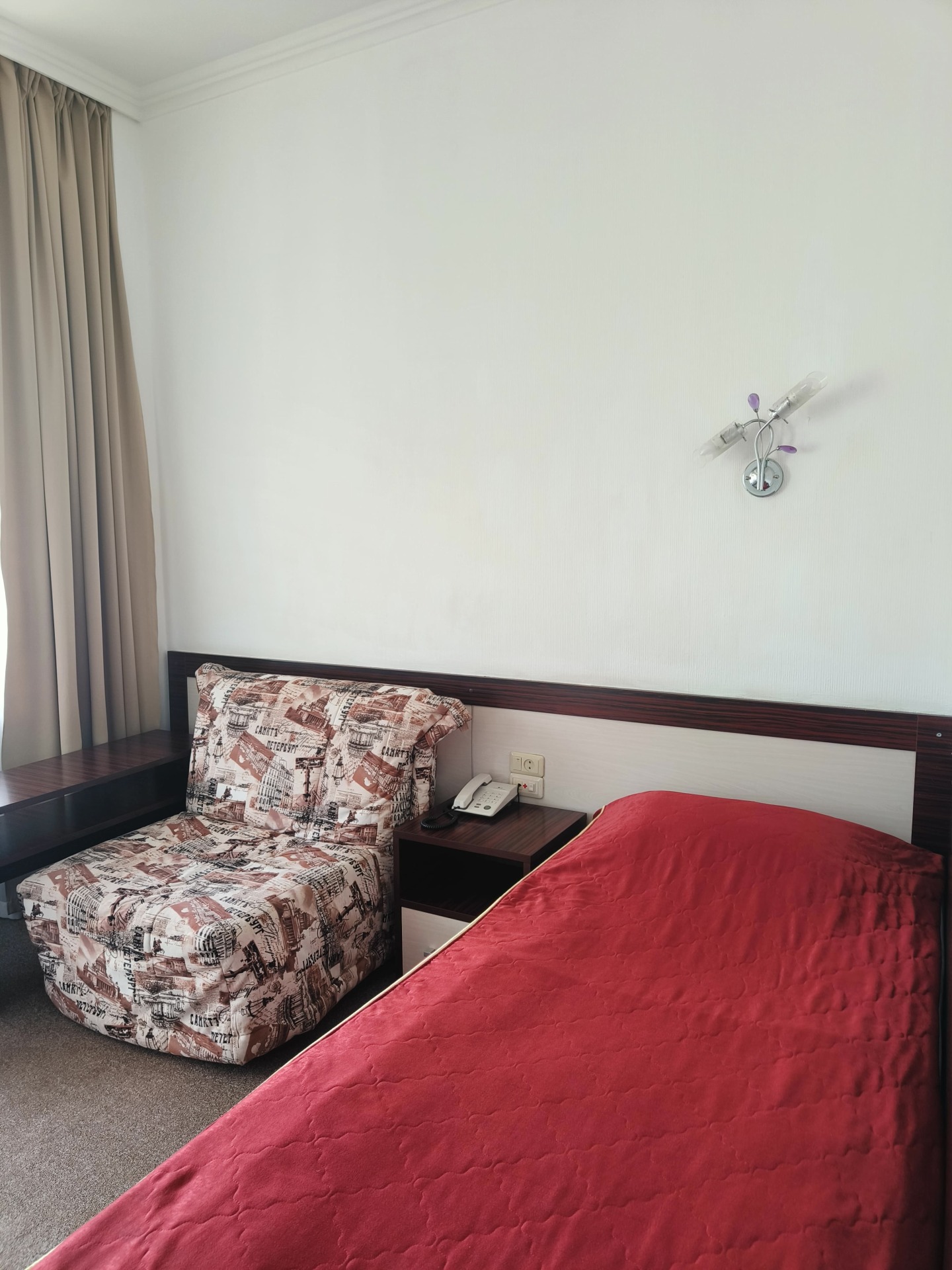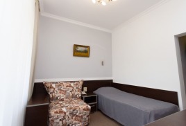 - 1-местный 1-комнатный номер (1 - 5 этаж). Площадь номера: 17,6 кв.м. В номере: балкон, односпальная кровать, кресло-кровать, телевизор, холодильник, электрический чайник, чайный набор. Санузел с душевой кабиной, фен.