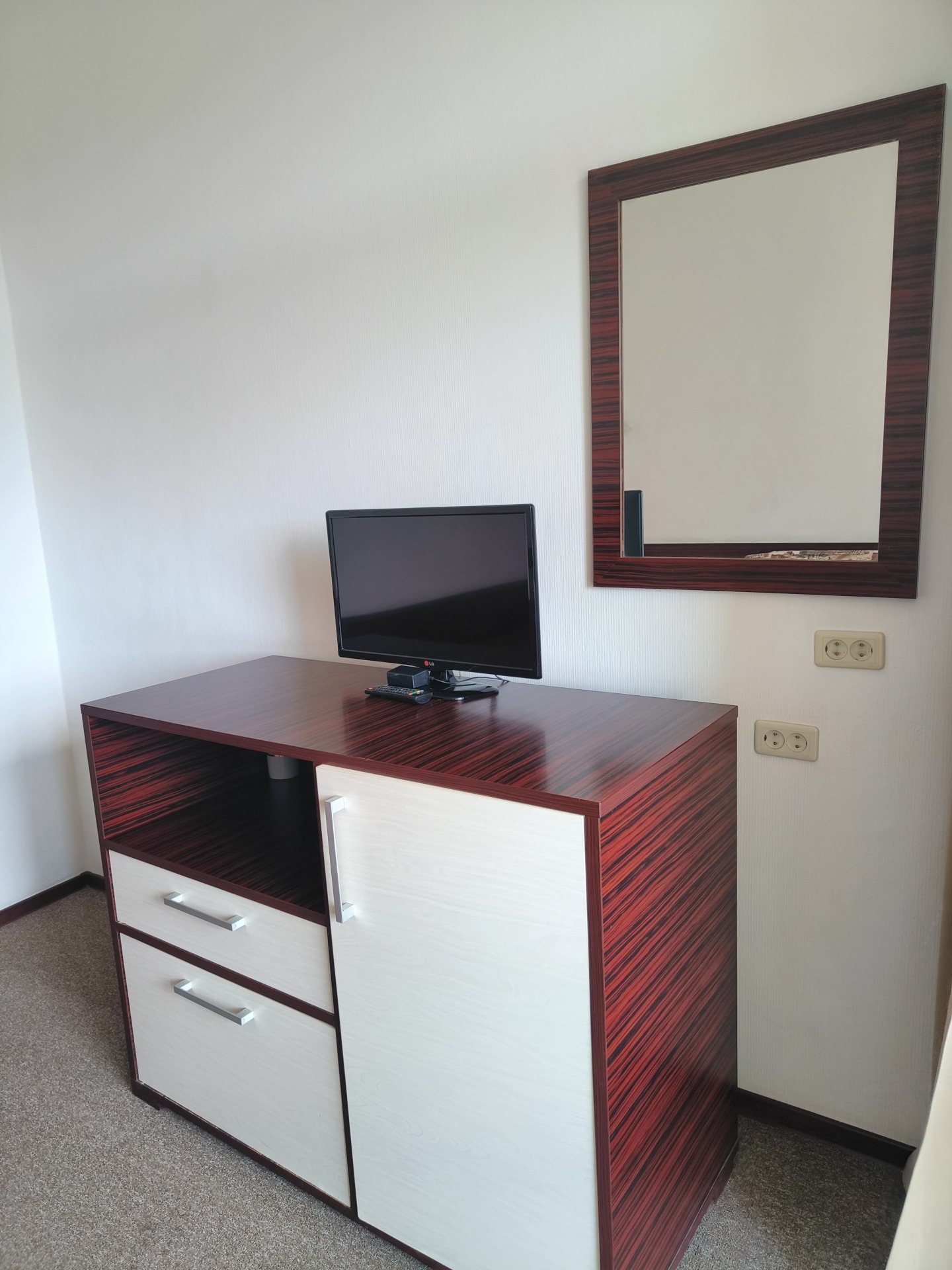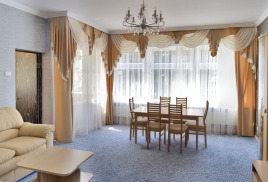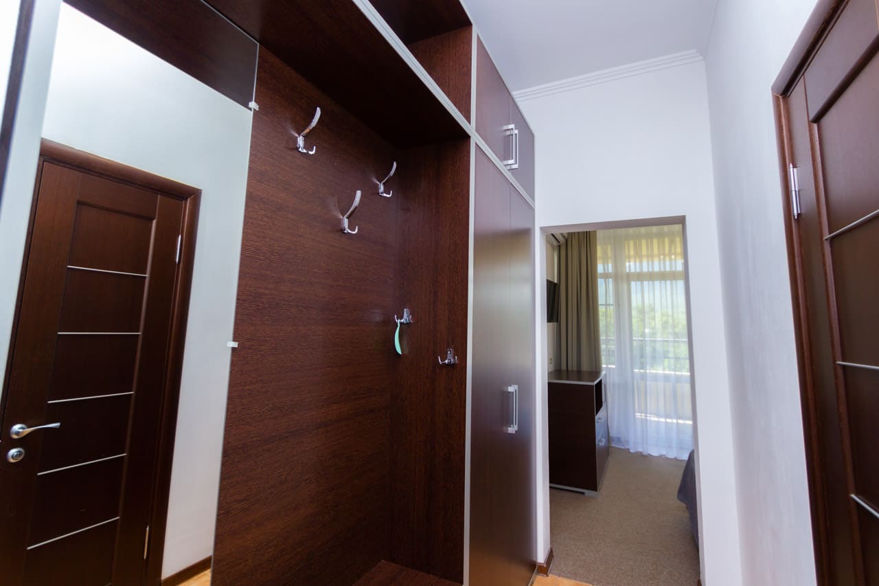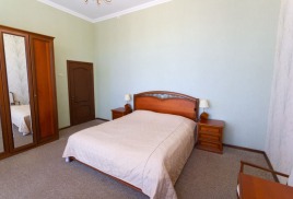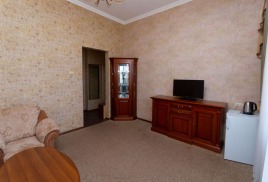 - 2-местный 3-комнатный Полулюкс. Площадь номера: 50 кв.м. В номере: балкон, спальня с двуспальной кроватью, гостиная с набор мягкой мебели, телевизор, холодильник, электрический чайник, чайный набор, набор посуды, гладильная доска, утюг, кабинет. Санузел с душевой кабиной, фен, халат, тапочки.