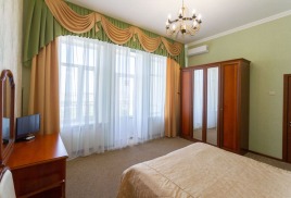 - 2-местный 3-комнатный номер Апартаменты. Площадь номера: 98,5 кв.м. В номере: балкон, спальня с двуспальной кроватью, сплит-система, гостиная с набор мягкой мебели, телевизор, холодильник, электрический чайник, чайный набор, набор посуды, гладильная доска, утюг, кабинет, кухня, два санузла, джакузи, ванна, фен, халат, тапочки.