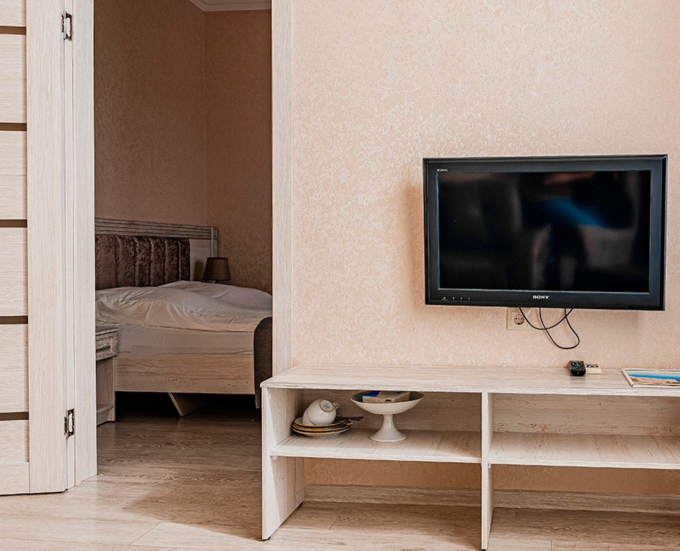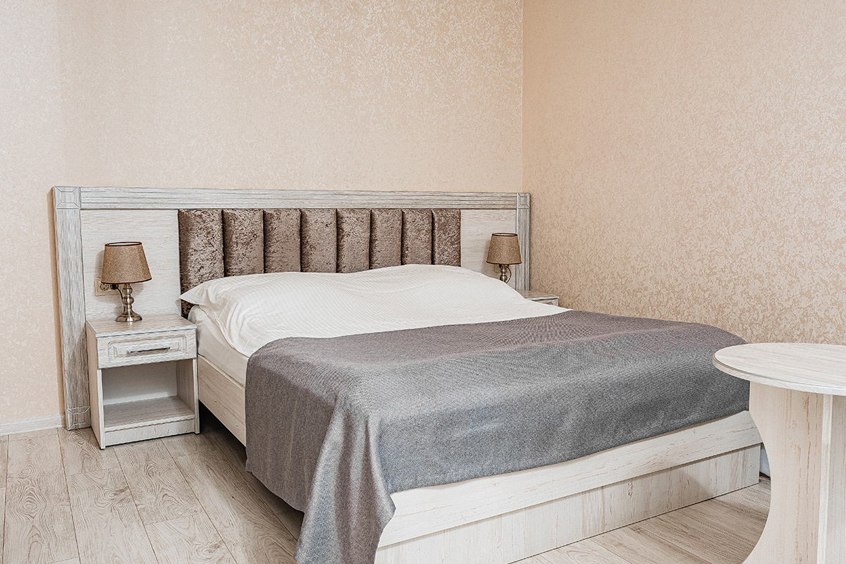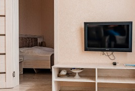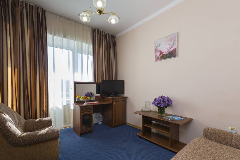 - 2-местный 2-комнатный 1-категории. Площадь 30 кв. м. В номере: гостиная с мягкой мебелью, спальня с двуспальной кроватью, телевизор, холодильник, кондиционер, электрочайник, санузел с ванной. Дополнительное место - диван.