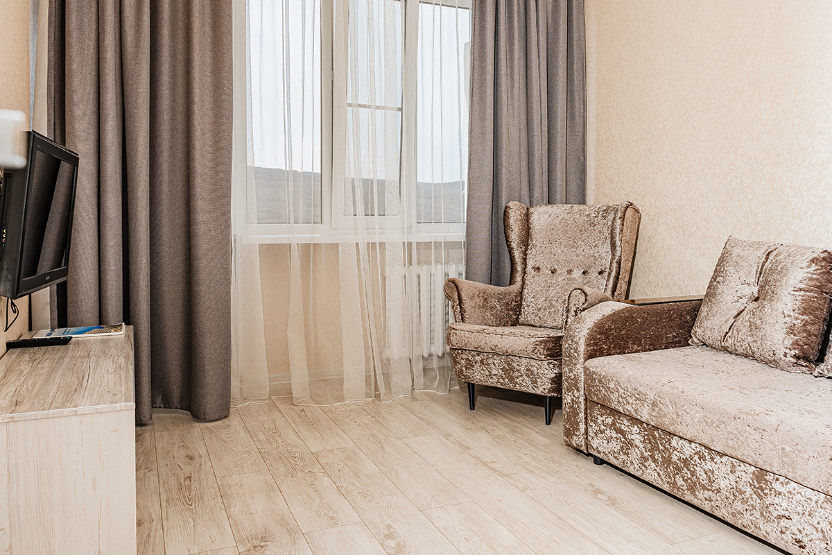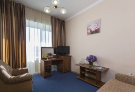 - 2-местный 2-комнатный люкс. Площадь 30 кв.м.В номере: гостиная с мягкой мебелью, спальня с двуспальной кроватью или двумя односпальными, телевизор, холодильник, кондиционер, электрочайник, телефон, санузел с душем или ванной, фен. Дополнительное место - диван.