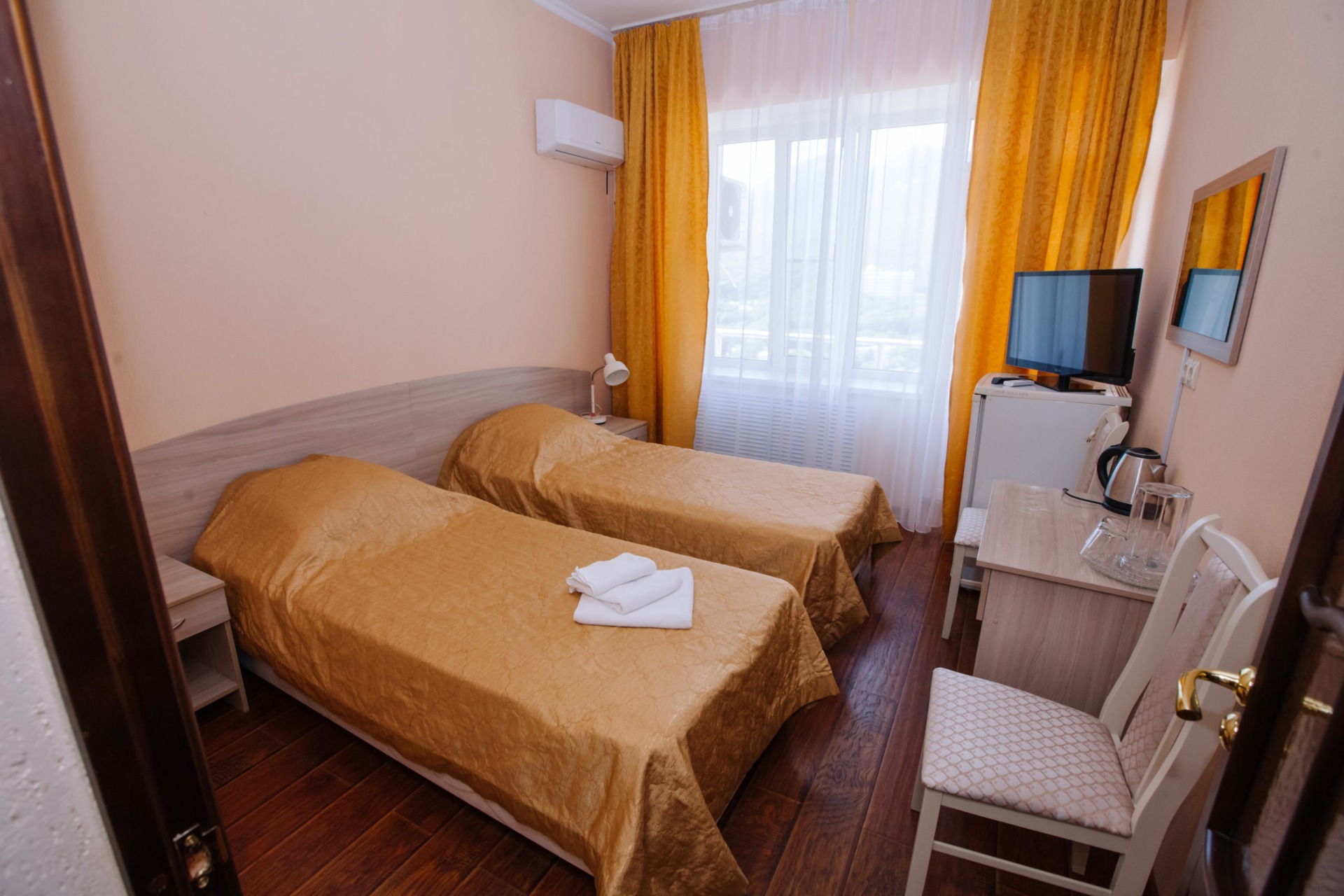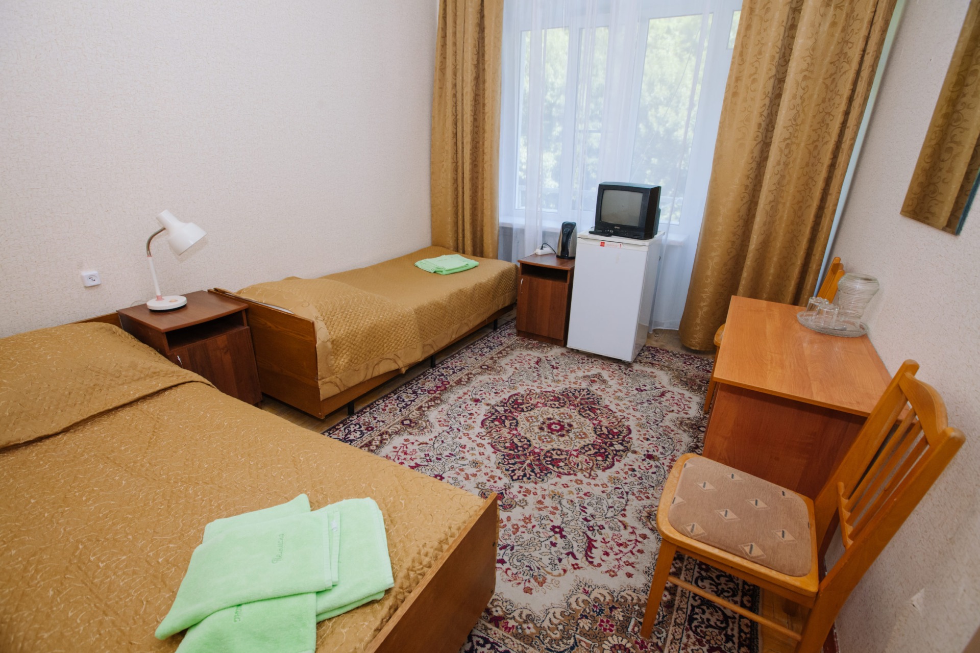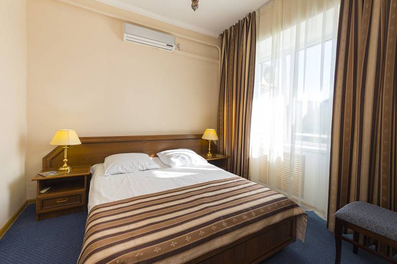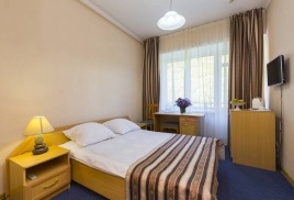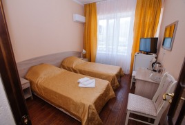 - 2-местный 1-категории. Площадь 12 кв. м. В номере: две односпальные кровати, телевизор, холодильник, кондиционер, электрочайник, санузел с душем. Дополнительное место не устанавливается.