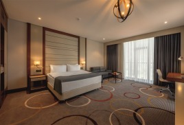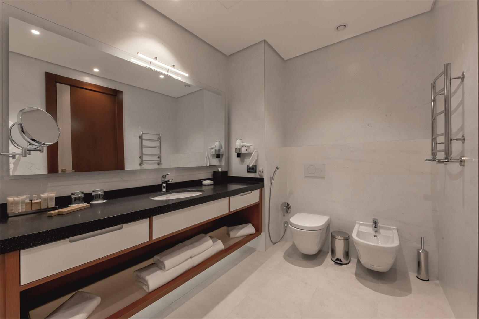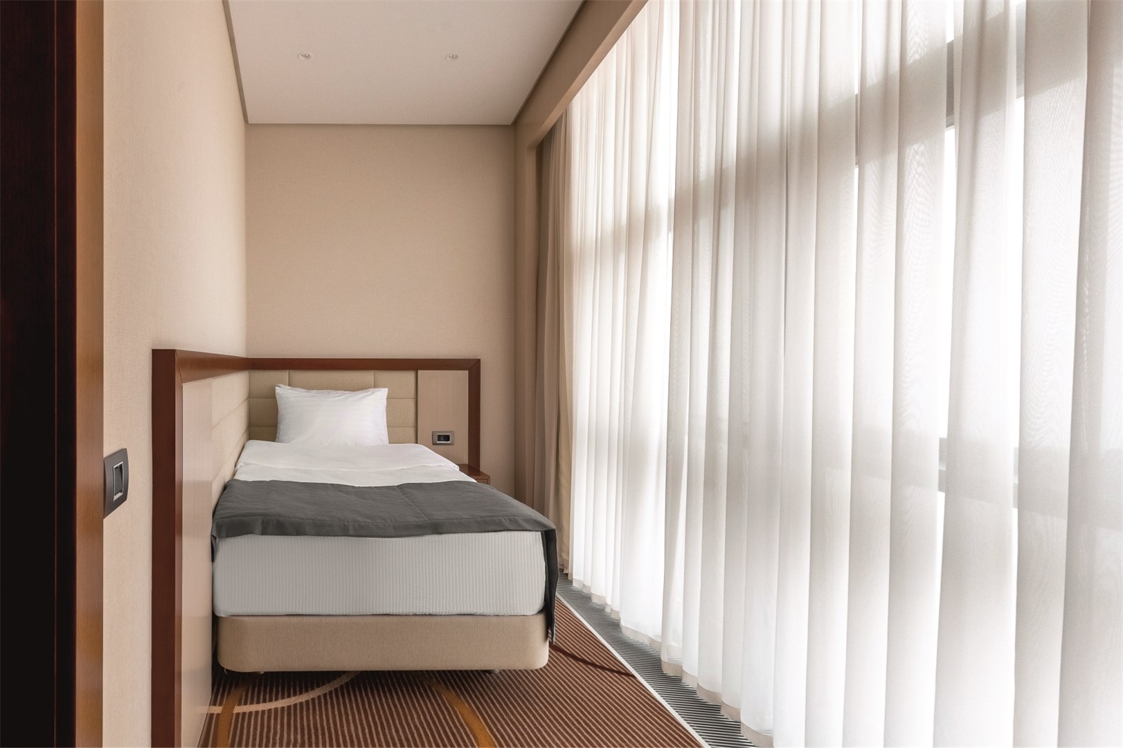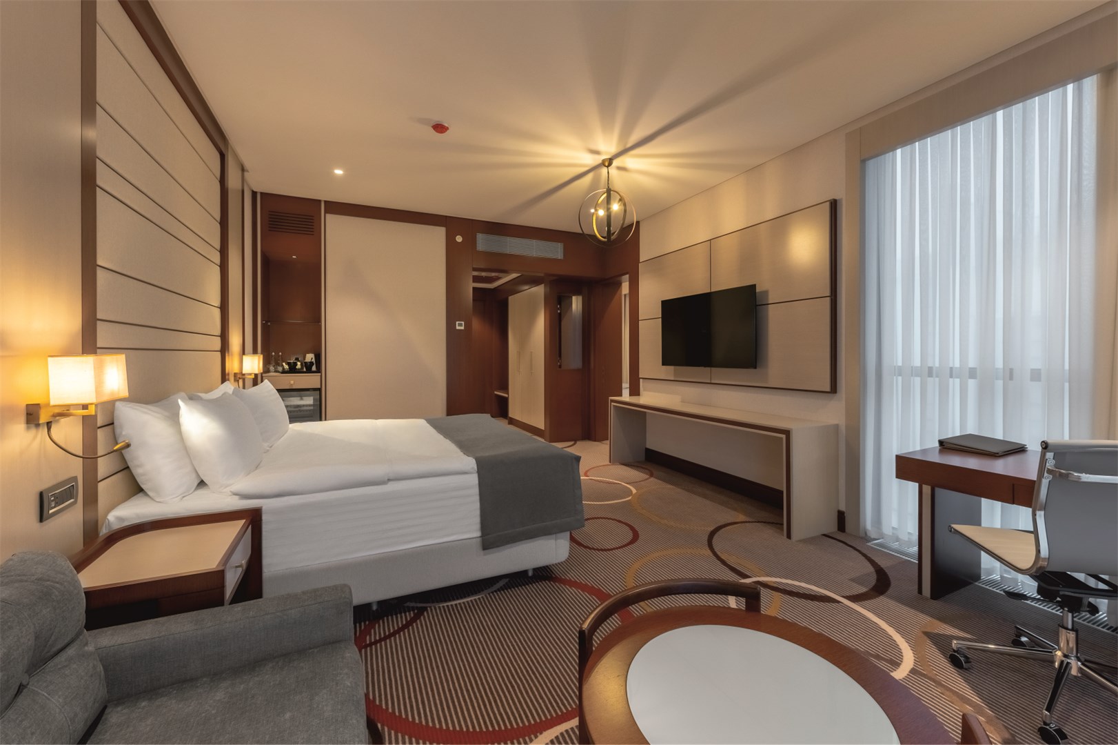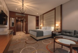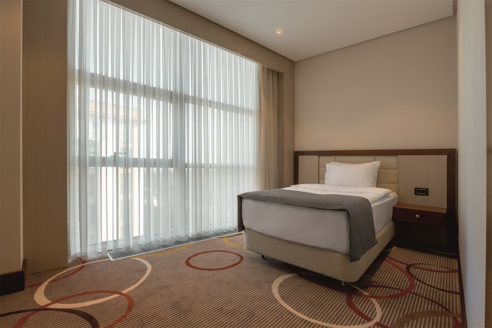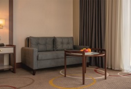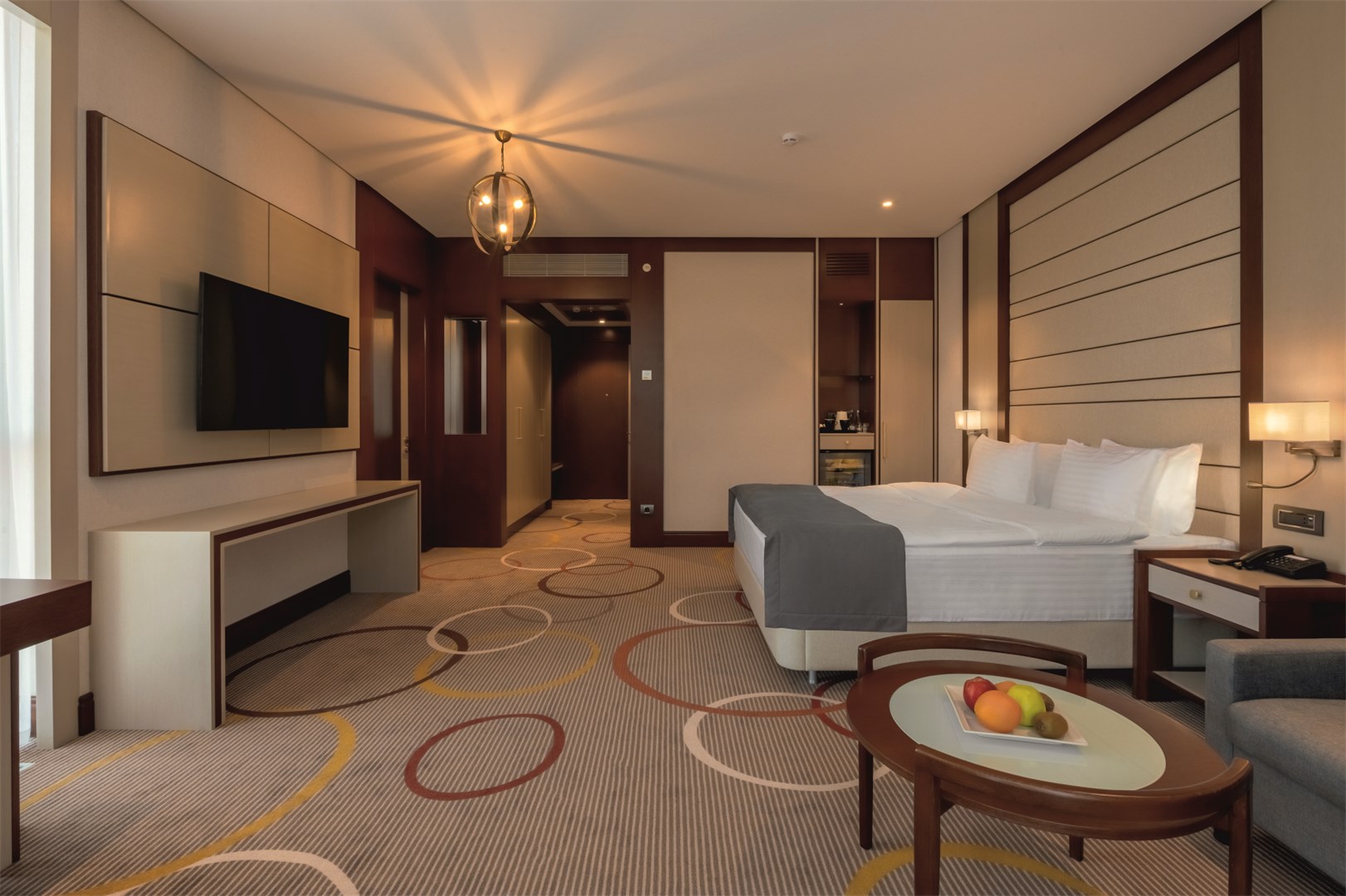 - 2-местный 1-комнатный Джуниор. Площадь 36 кв.м. В номере: две односпальные кровати или одна двуспальная кровать, диван, ЖК телевизор, холодильник, мини-бар, система климат-контроль, сейф, электрический чайник, чайный набор, санузел с душевой кабиной, фен, халат, тапочки, гостиничная парфюмерия, французский балкон с видом на гору Бештау или на гору Железная.