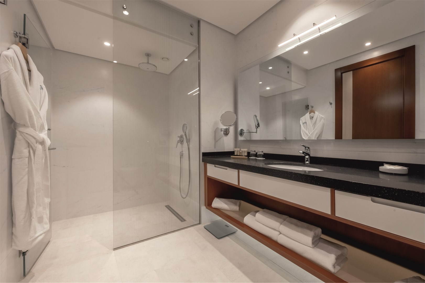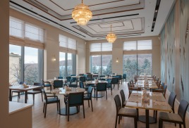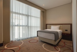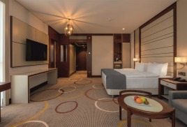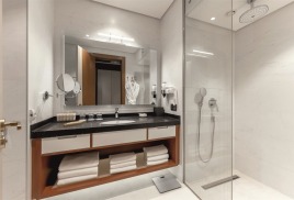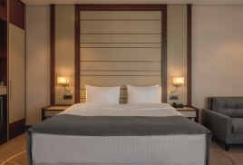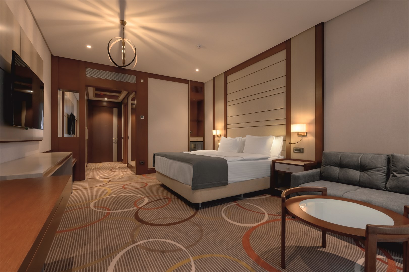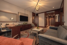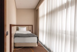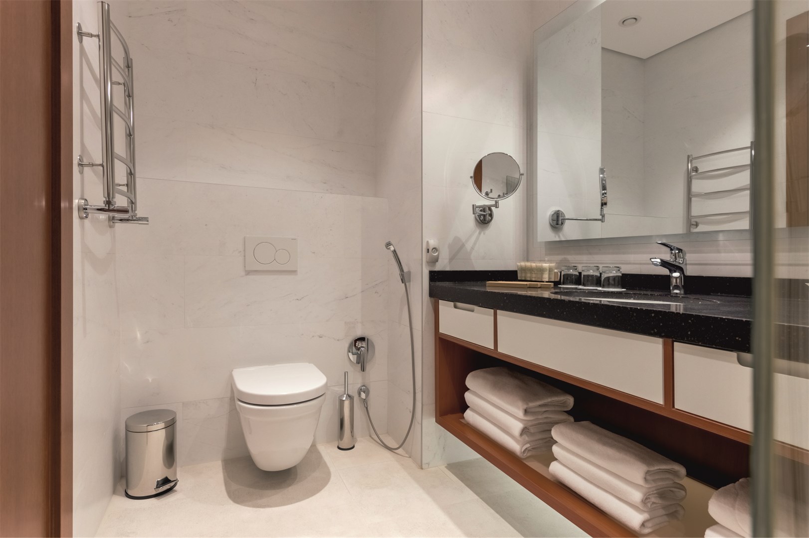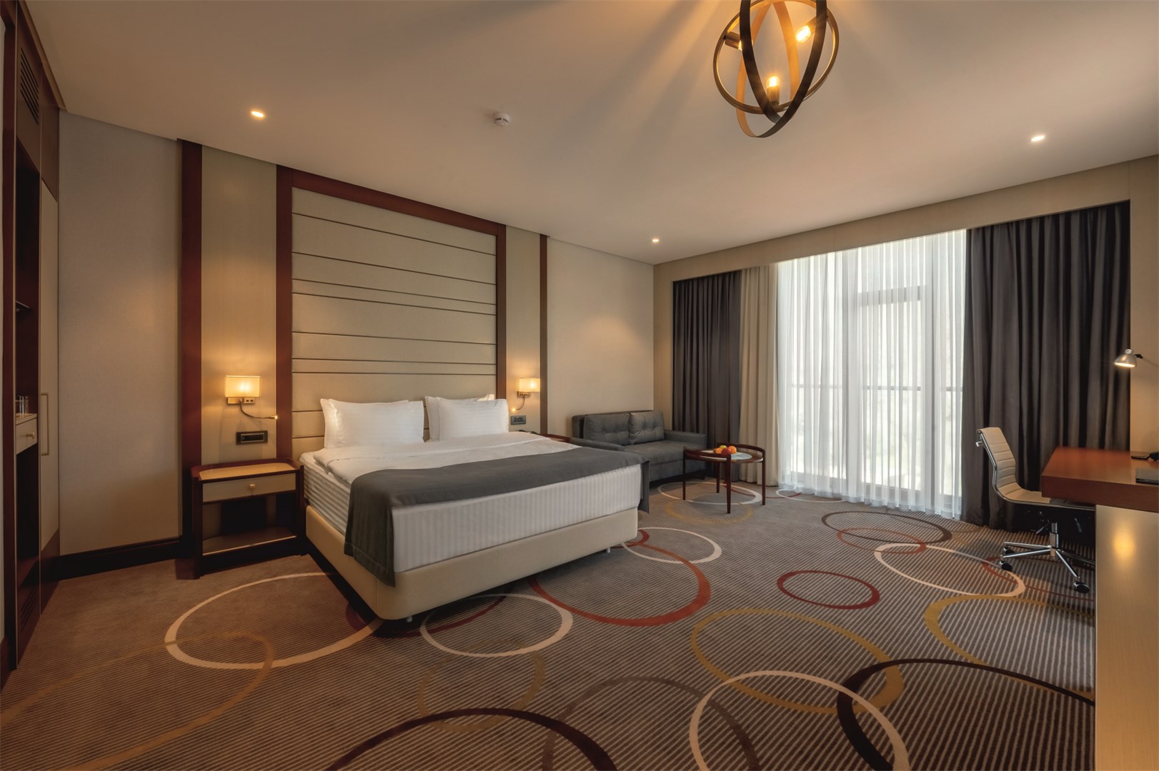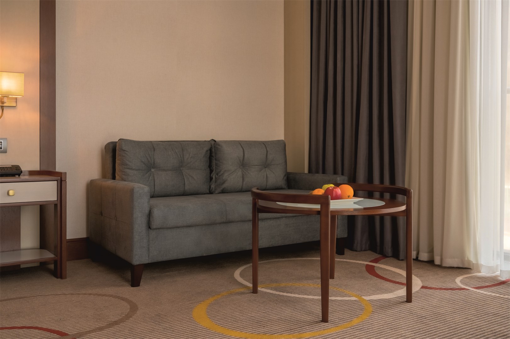 - 2-местный 1-комнатный Джуниор. Площадь 36 кв.м. В номере: две односпальные кровати или одна двуспальная кровать, диван, ЖК телевизор, холодильник, мини-бар, система климат-контроль, сейф, электрический чайник, чайный набор, санузел с душевой кабиной, фен, халат, тапочки, гостиничная парфюмерия, французский балкон с видом на гору Бештау или на гору Железная.