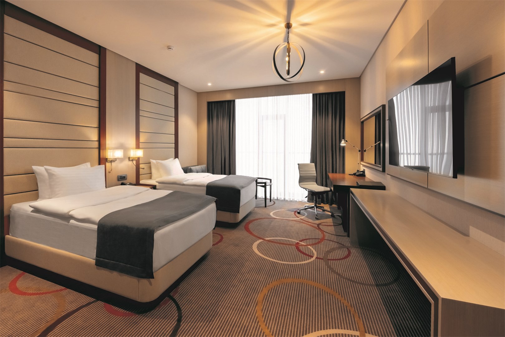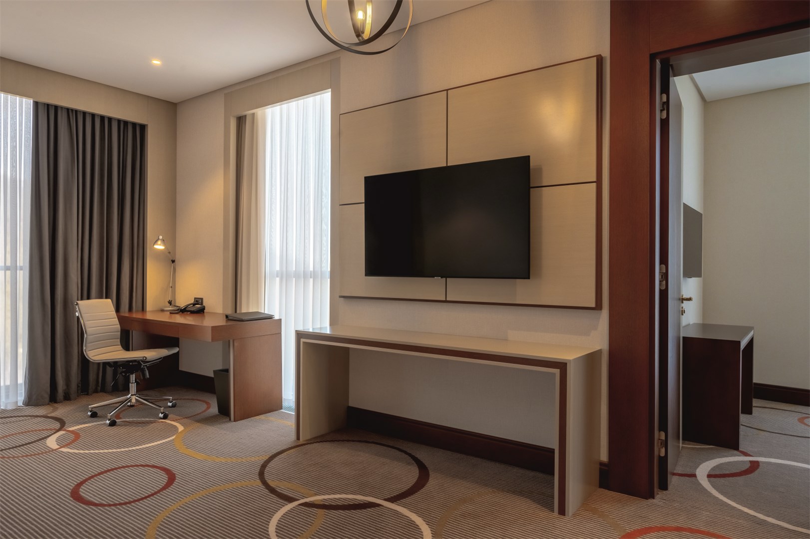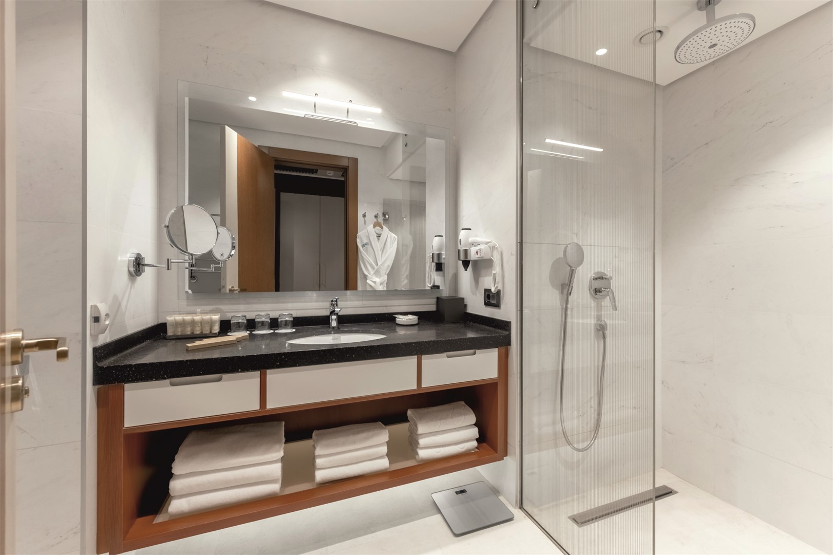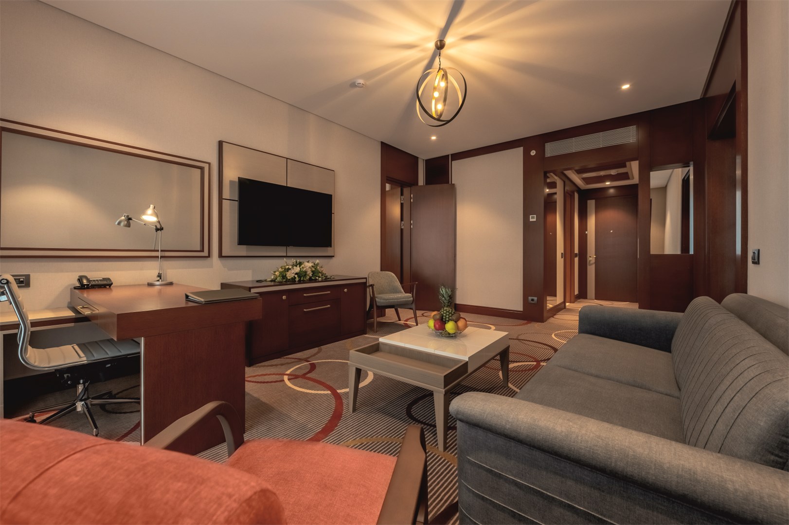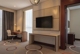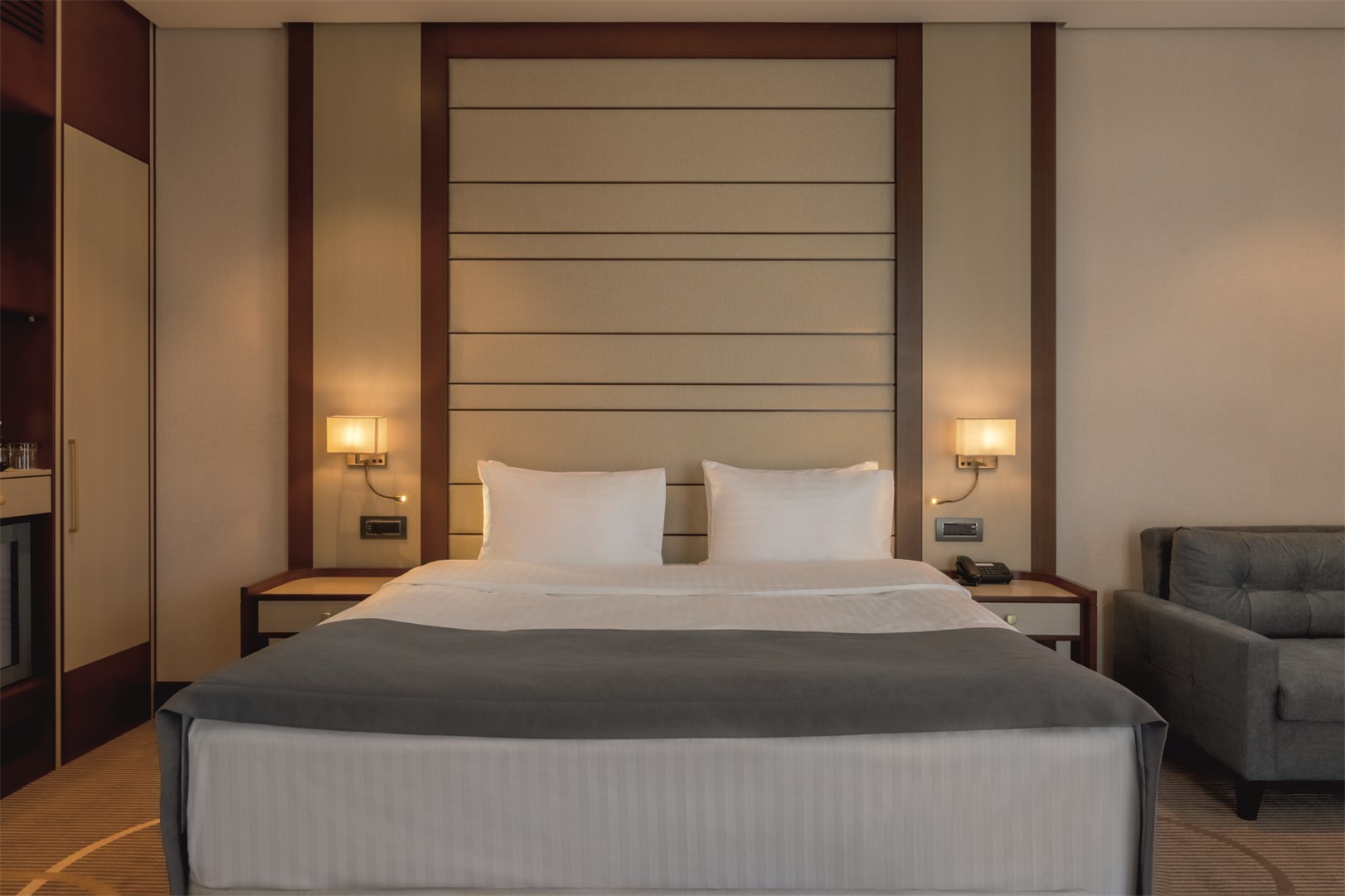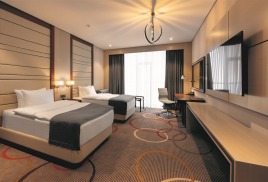 - 2-местный 1-комнатный Джуниор. Площадь 36 кв.м. В номере: две односпальные кровати или одна двуспальная кровать, диван, ЖК телевизор, холодильник, мини-бар, система климат-контроль, сейф, электрический чайник, чайный набор, санузел с душевой кабиной, фен, халат, тапочки, гостиничная парфюмерия, французский балкон с видом на гору Бештау или на гору Железная.