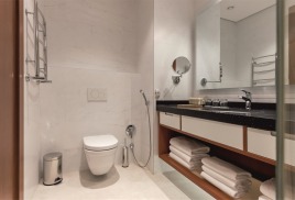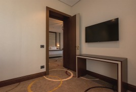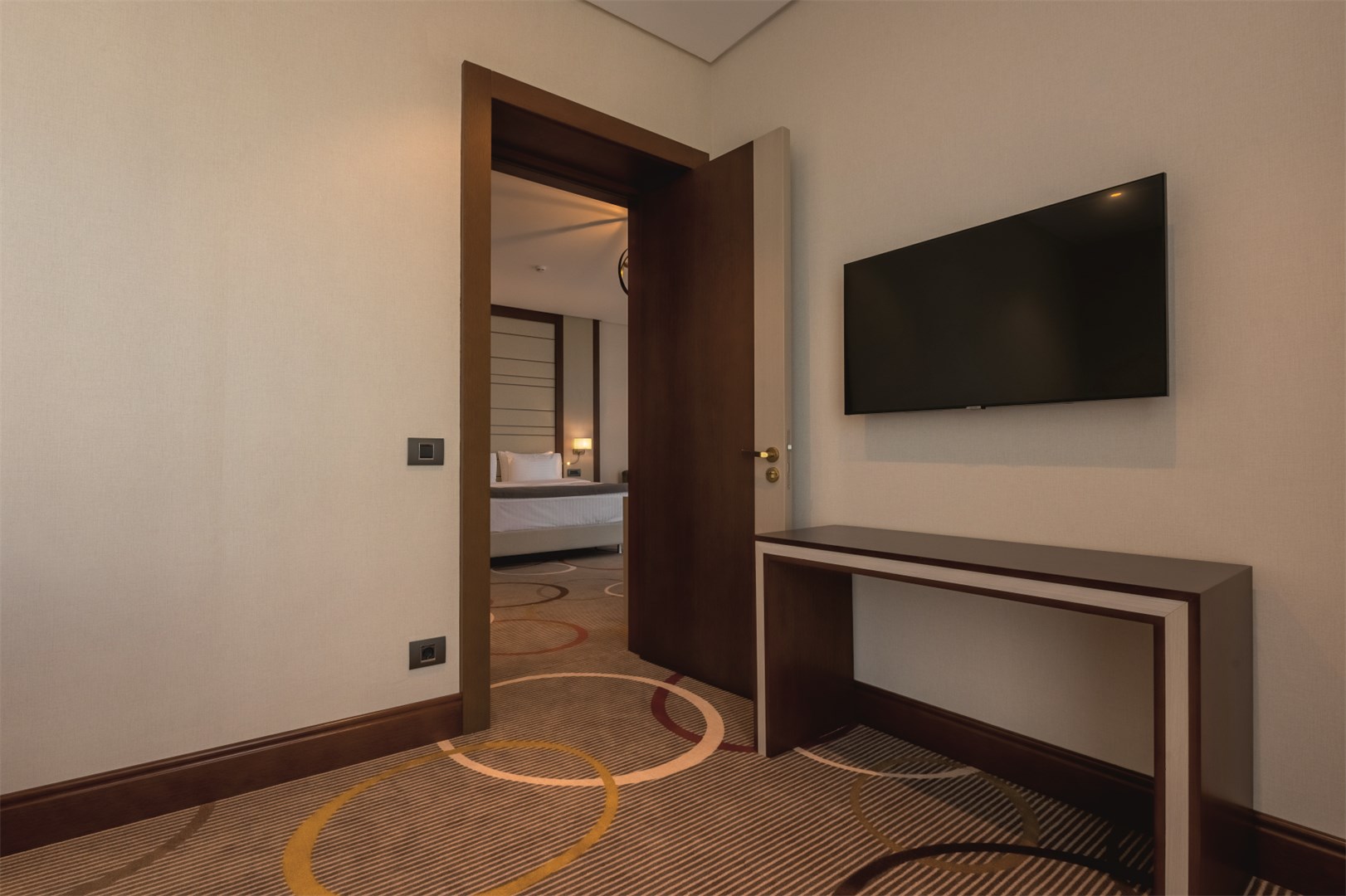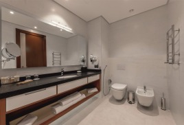 - 3-местный 2-комнатный Семейный. Площадь 45 кв.м. В номере: спальня с двуспальной кроватью, комната с одной односпальной кроватью, диван, ЖК телевизор, холодильник, мини-бар, система климат-контроль, сейф, электрический чайник, чайный набор, санузел с душевой кабиной, фен, халат, тапочки, гостиничная парфюмерия, французский балкон с видом на гору Бештау.