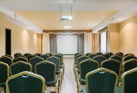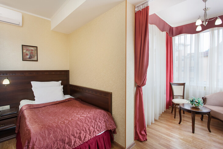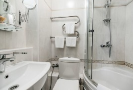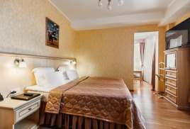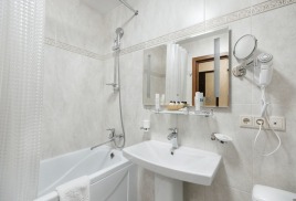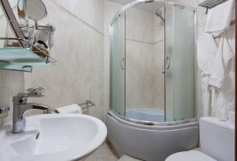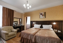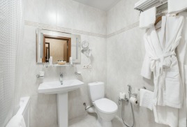 - 1-но местный Стандарт (16 м2): кровать 140×200, телевизор, сейф, минибар, холодильник, электрочайник, набор посуды для минибара, душевая кабина, биде, фен, халаты, тапочки, набор полотенец, набор косметики.