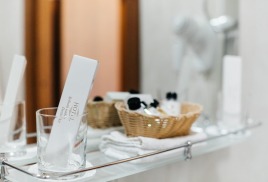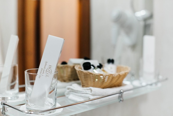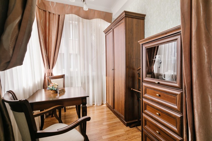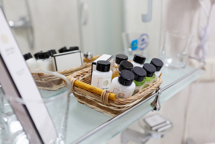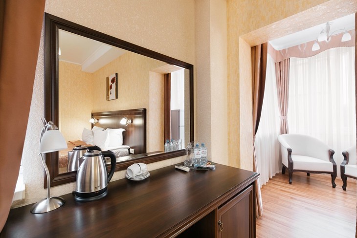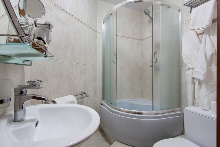 - 2-х местный Комфорт (25 м2): кровать 180×200, телевизор, сейф, минибар, холодильник, электрочайник, набор посуды для минибара, душевая кабина, биде, фен, халаты, тапочки, набор полотенец, набор косметики.