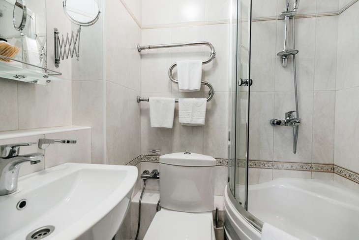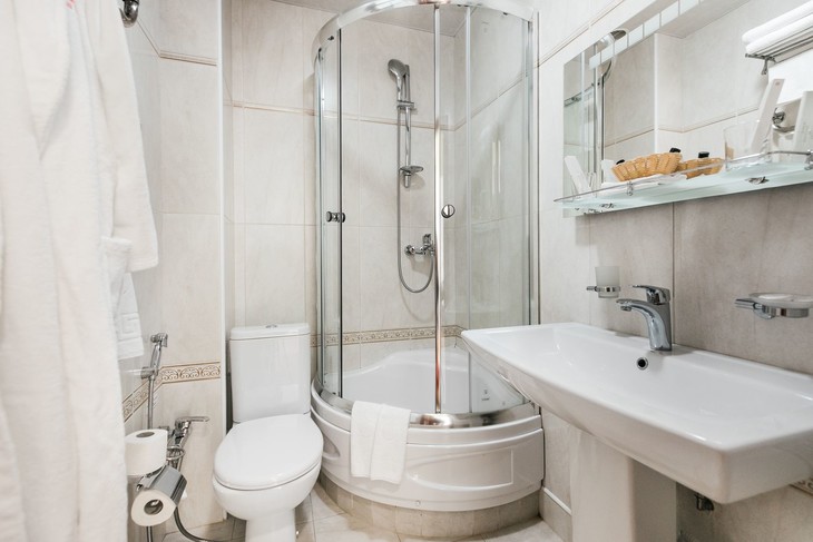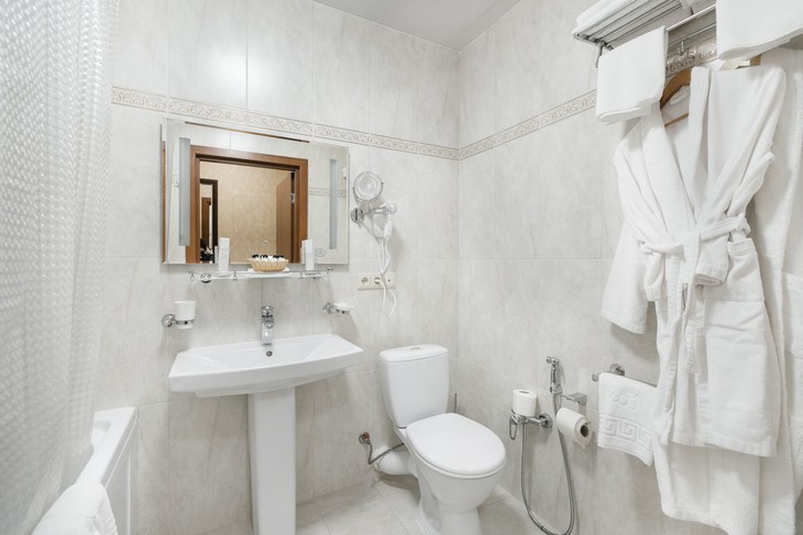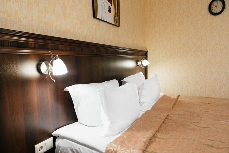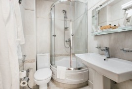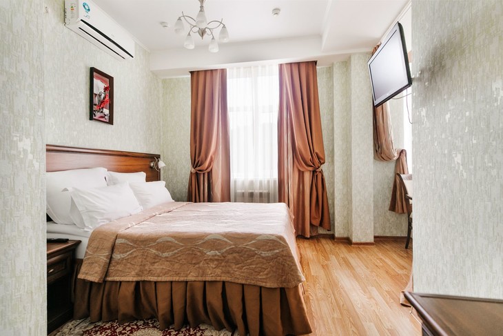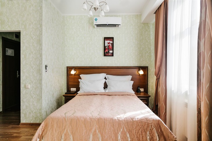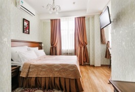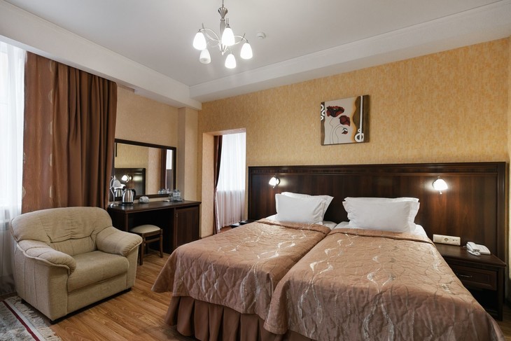 - 2-х местный Стандарт (20-23 м2): кровать 180×200, телевизор, сейф, минибар, холодильник, электрочайник, набор посуды для минибара, душевая кабина, биде, фен, халаты, тапочки, набор полотенец, набор косметики.