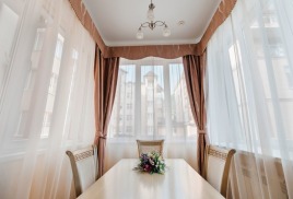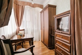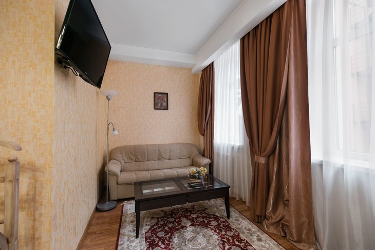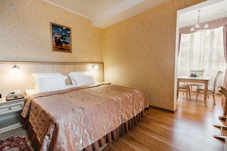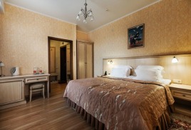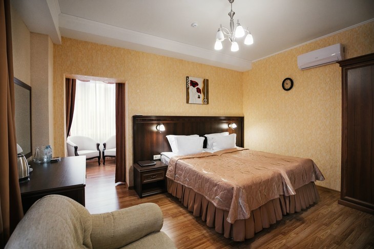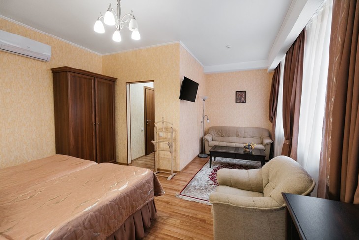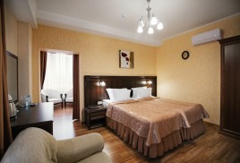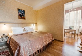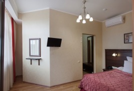 - 2-х местный Люкс: гостиная с мягкой мебелью и обеденным столом, кровать двуспальная 180х200, телевизор, сейф, минибар, кондиционер, душевая кабина, биде, фен, халаты, тапочки, набор полотенец, набор косметики. Кухонный уголок с обеденным столом: микроволновой печью, холодильником, электроплитой, электрочайником, набором посуды.