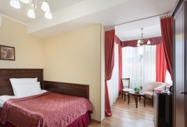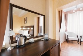 - 2-х местный Джуниор сюит: диван, кровать двуспальная/односпальные, телевизор, сейф, минибар, холодильник, кондиционер, электрочайник, набор посуды для минибара, душевая кабина, биде, фен, халаты, тапочки, набор полотенец, набор косметики.
